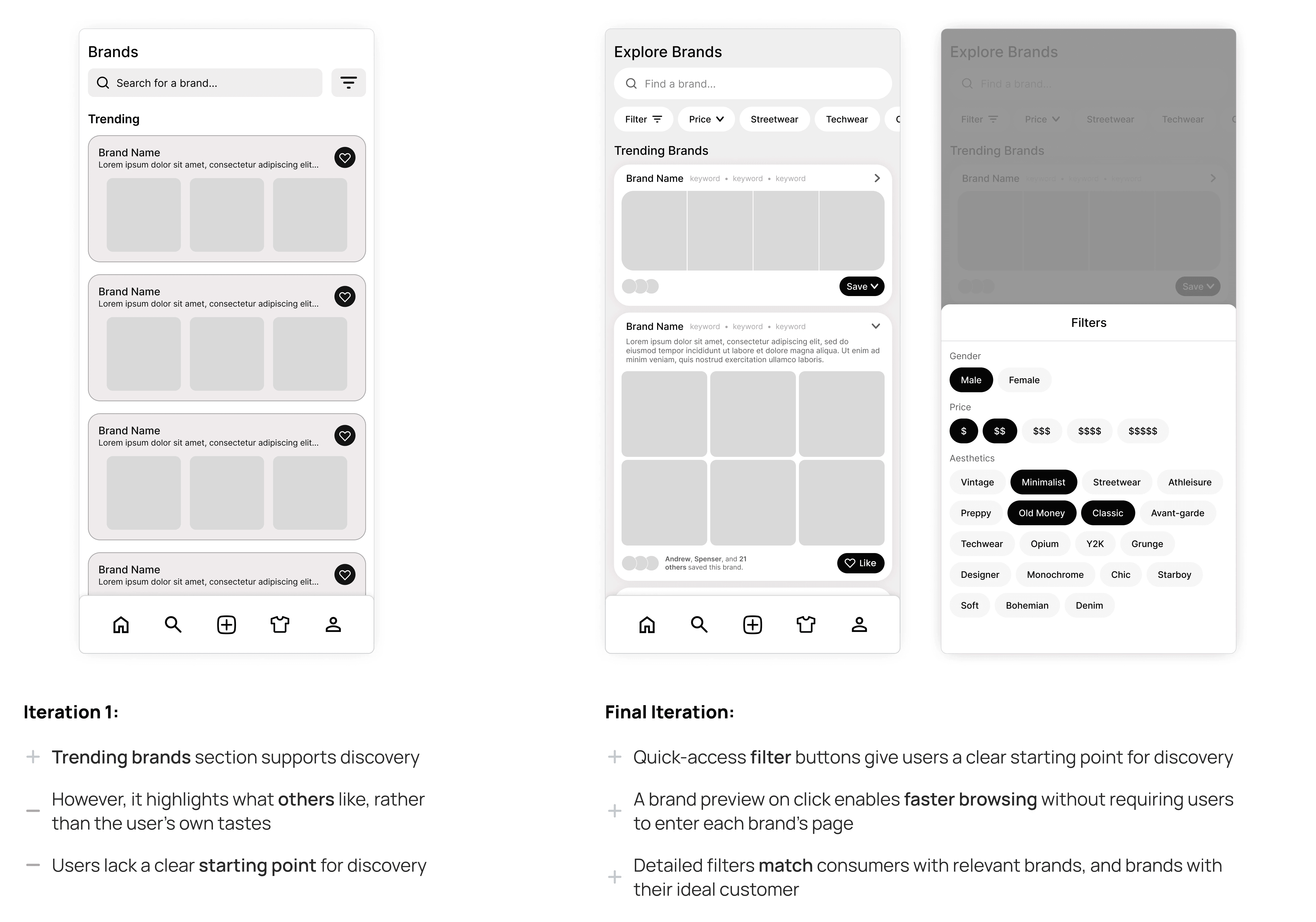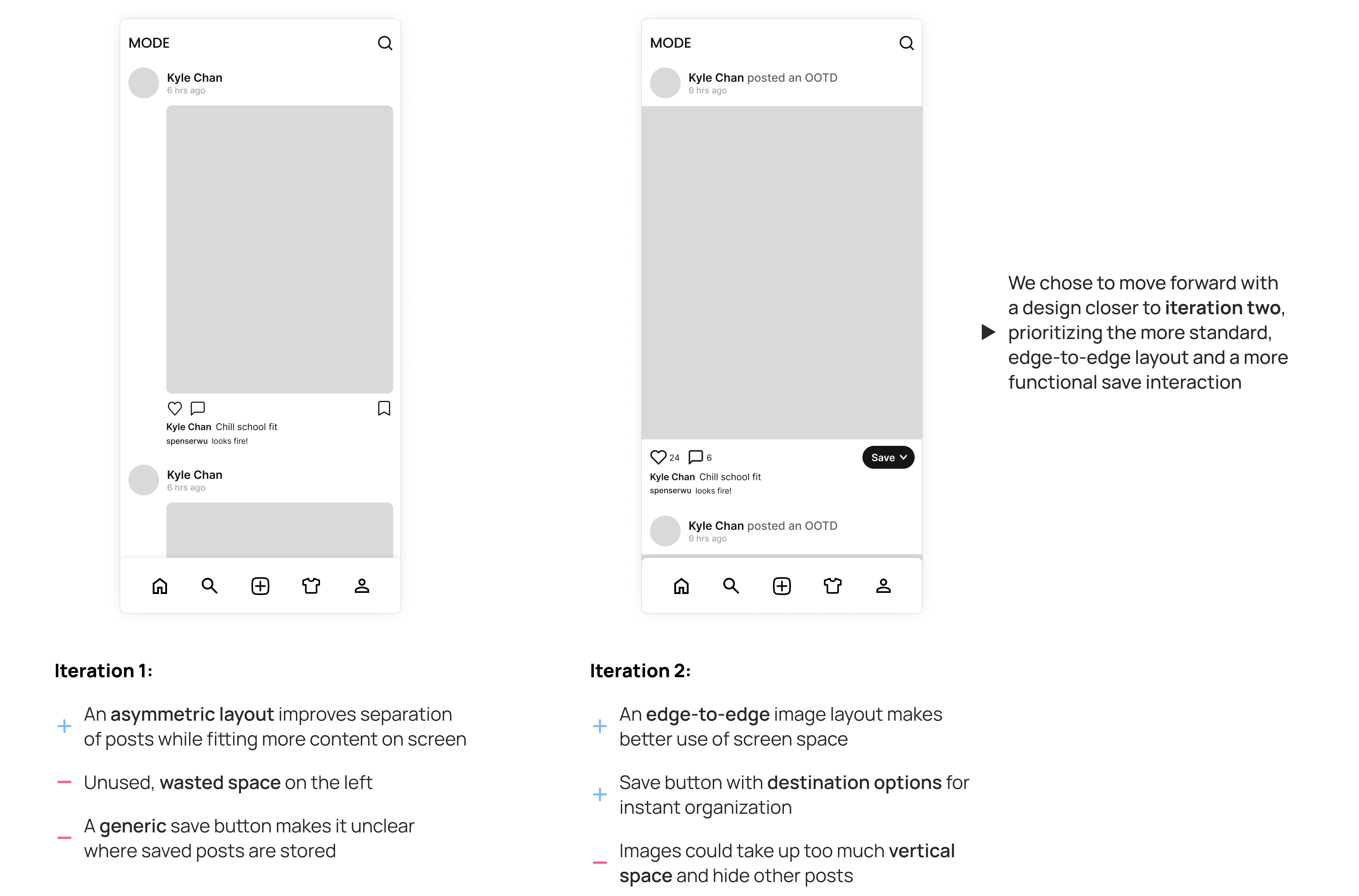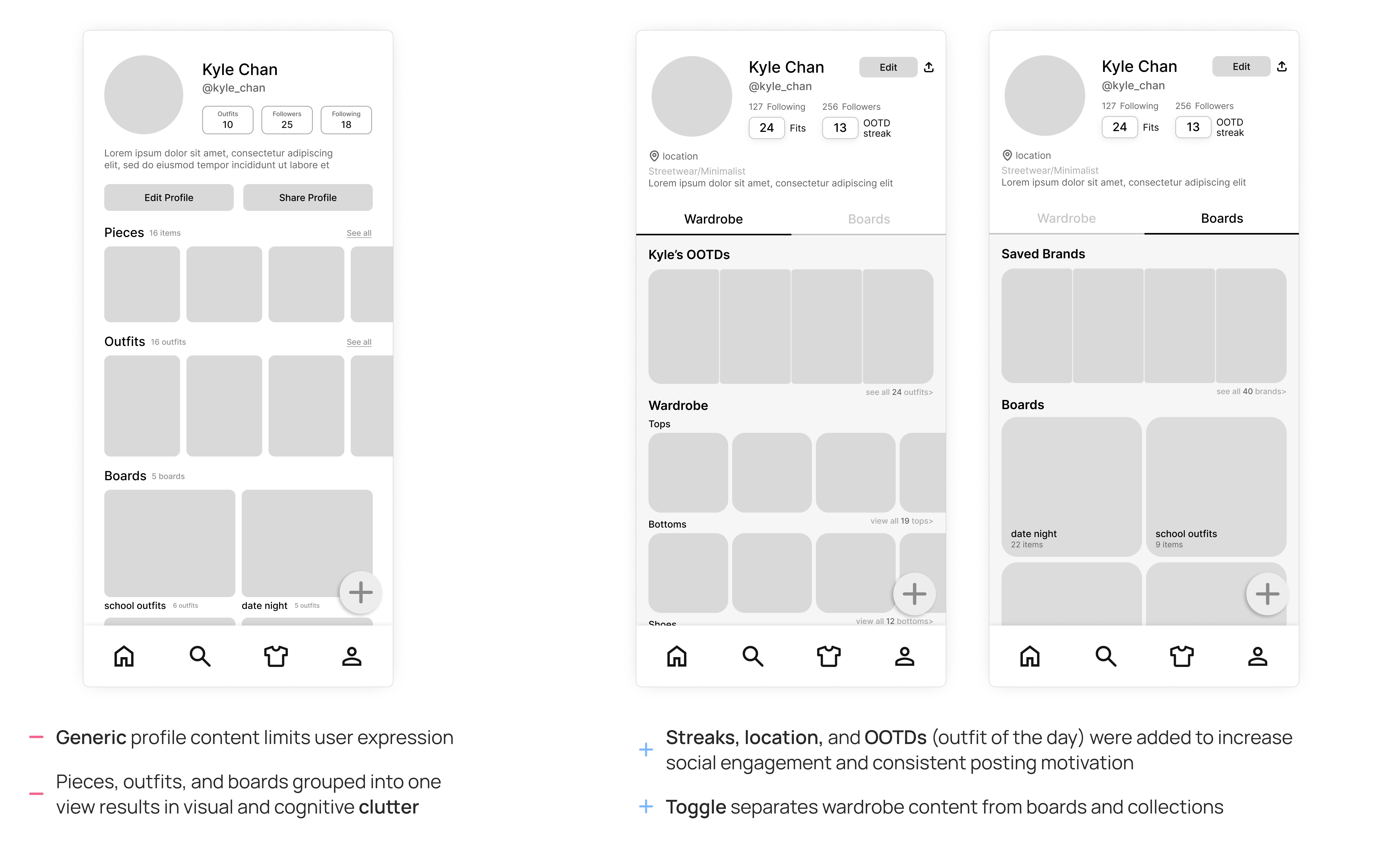 The Profile Page needed to integrate individual items, outfit posts, and boards, but early versions treated them too similarly. Refining this structure made it easier to navigate while making the profile more engaging for curation and inspiration