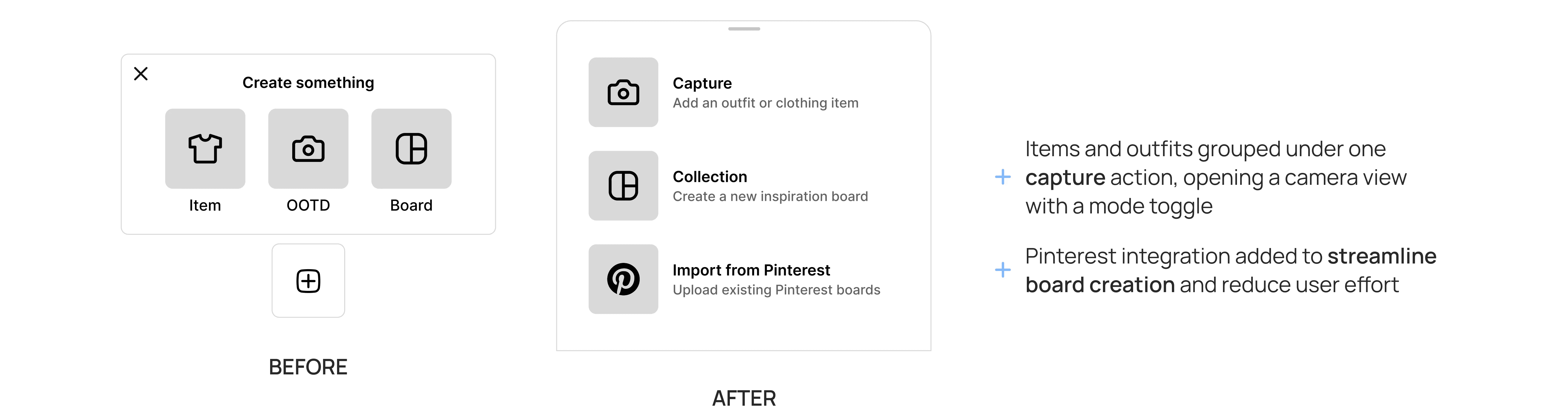 When the user actually presses add, it originally revealed three options; item upload, outfit upload, and board creation. However, user interviews showed that most users already organize outfit inspiration through Pinterest boards.
