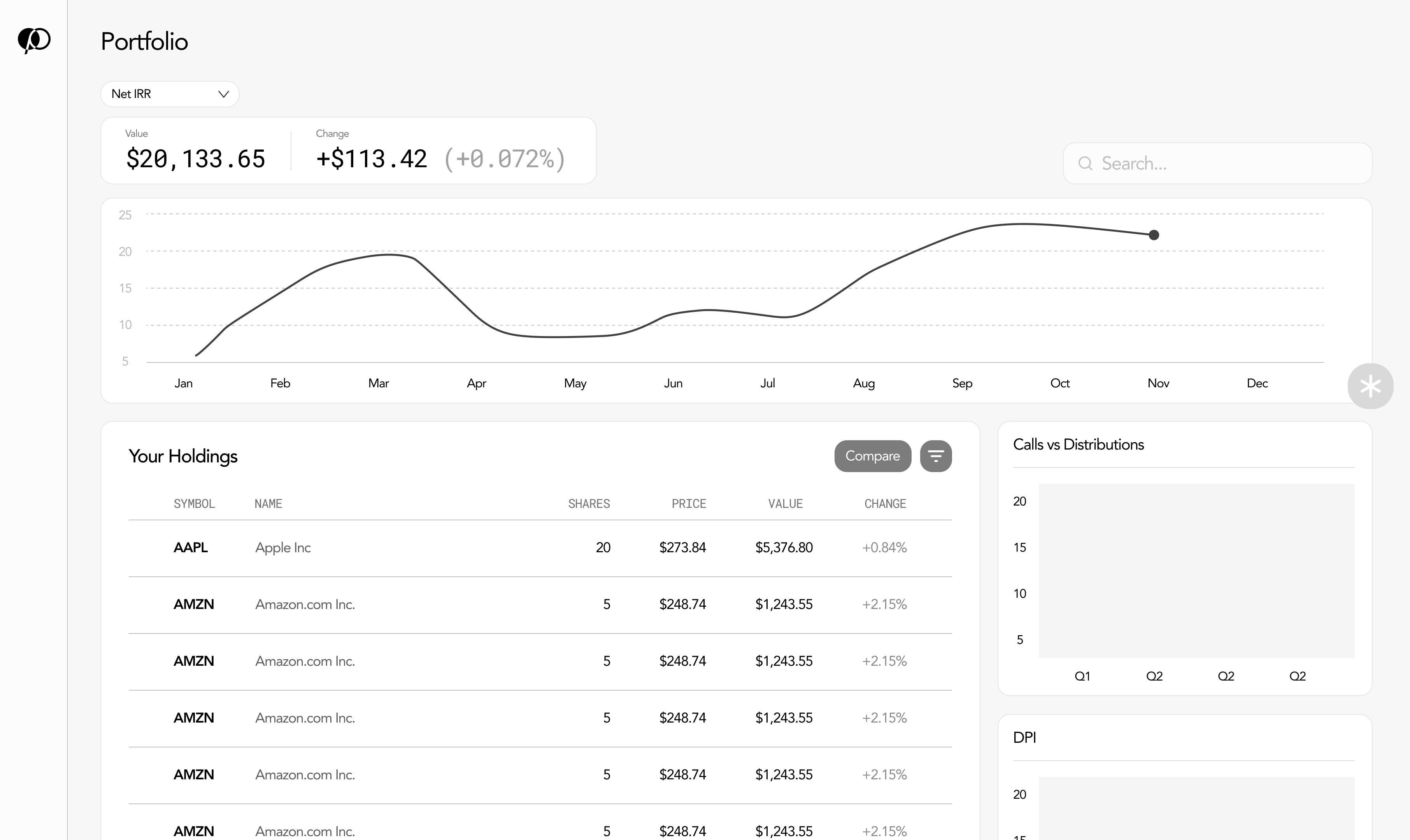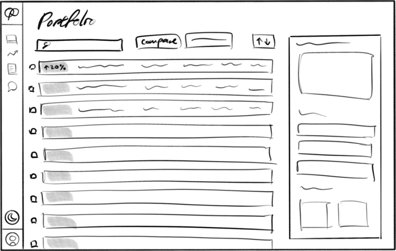 First portfolio concept with simple list view of investments and side bar for metrics and graphs