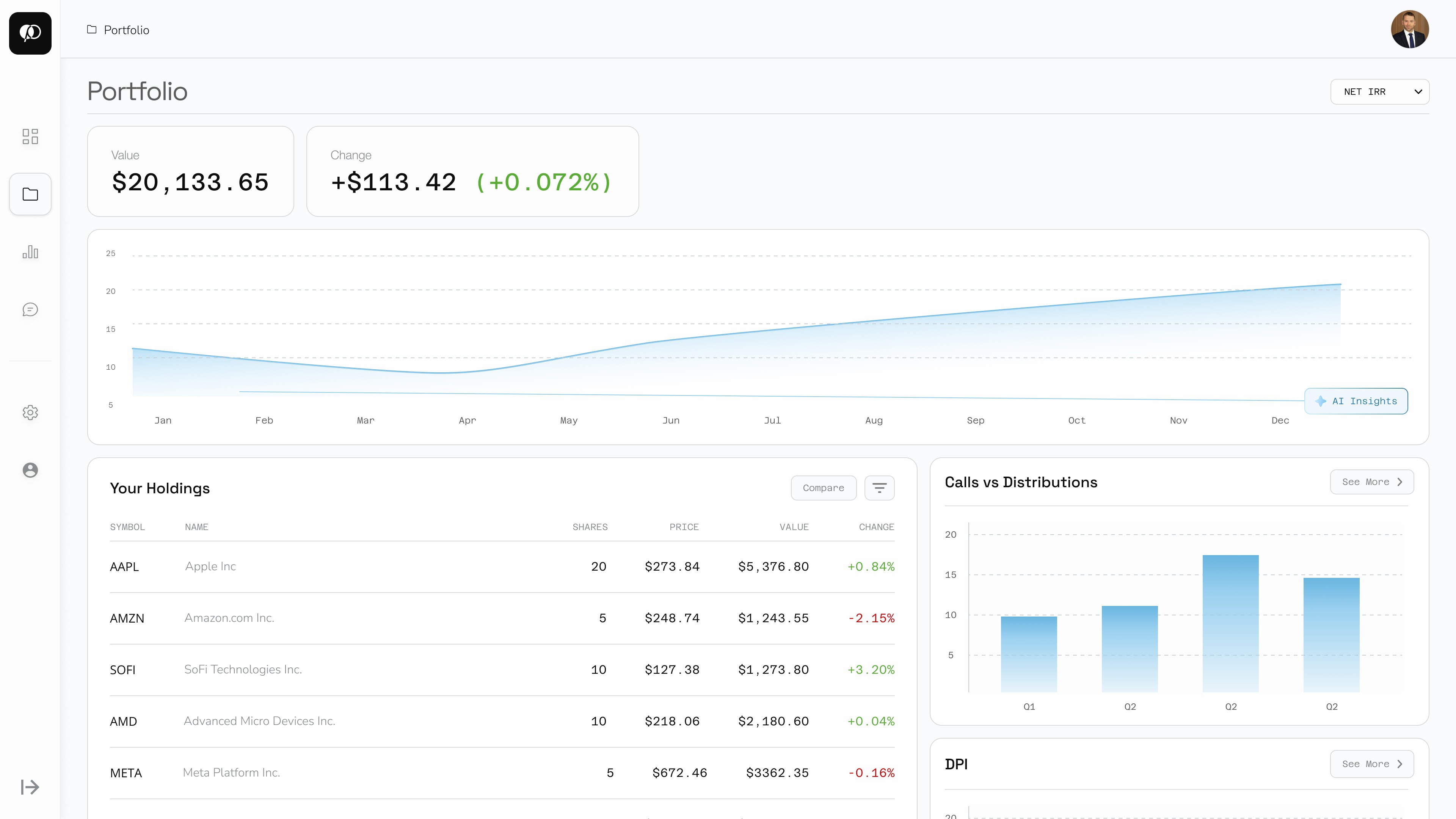 A snapshot of your portfolio value and recent performance change + a holdings table and charts detailing allocations and cash flow.